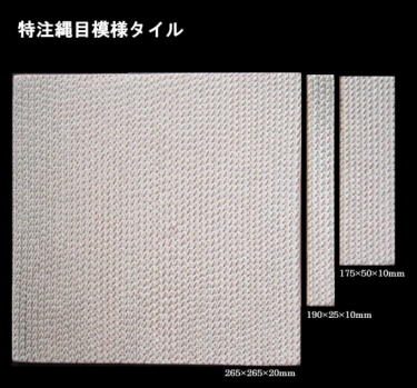 3月のトピックスは、‘特注網目模様タイル&ボーダー‘です。製法は、湿式ハンドメイドプレス製法です。土練器から帯状に圧縮成形された生地を、ピアノ線で焼成寸法265mm角、195×25mm、175×50mmになるように概ねカットし、予め制作しておいた凹凸のある縄目石膏型でプレス成形、乾燥後、白のドロ釉を施釉、そしてまた乾燥後、表面を手で摺り、凸部分のドロ釉を軽く落とし焼成して制作致しました。素朴な凹凸のある縄目模様と白のドロ釉の調和が温かみのある空間を表現致します。