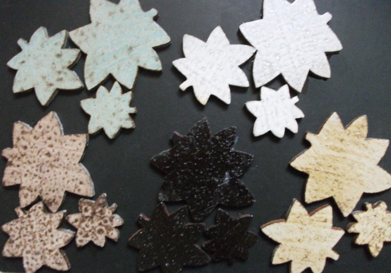 11月のトピックスは、‘特注紅葉型タイル‘です。製法は、湿式ハンドメイド抜き型製法です。土練器から帯状に圧縮成形された生地を、ピアノ線で焼成寸法大・中・小になるように概ねカット・予め制作しておいた抜き型で成型・乾燥後、アース系のドロ釉で施釉・焼成して制作致しました。手作り特有の温かみとざっくりした質感が独特の空間を演出致します。今回は床でのご使用も考え、ざらっとした質感を目指しましたが、軟解釉やブライト釉を使い焼き物の質感を強調する仕上げも楽しん頂けると思います。